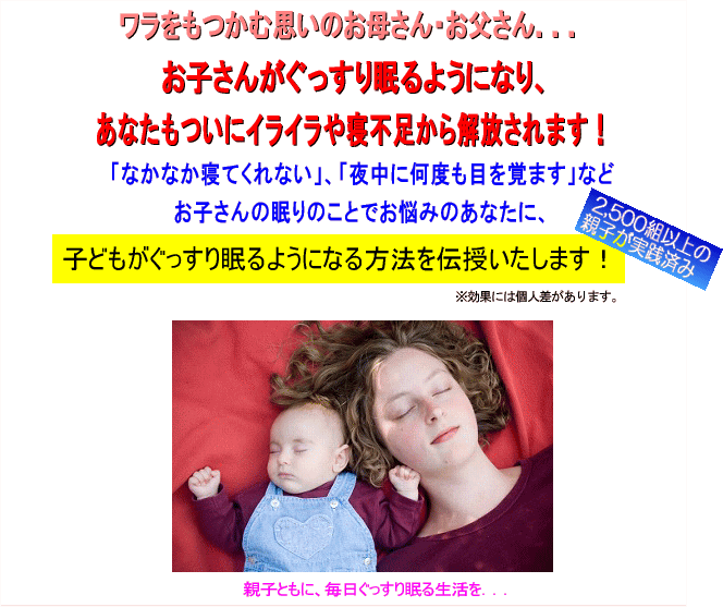 そして、あなたも、「子供がなかなか寝てくれない」、「夜泣きがおさまらない」、「夜中に何度も起こされる」という毎日から解放され、育児をもっと楽しむことができます! ![]() お子さんの健全な発育に、よい眠りは欠かせません。  |